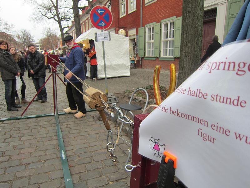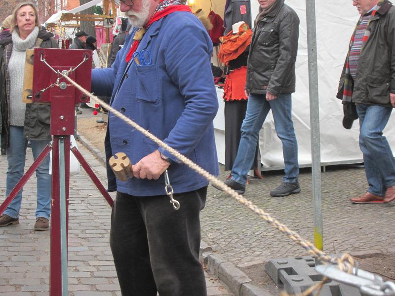 Die Schnüre sind gespannt und werden mit Hilfe des Bolzens miteinander verdrillt. Der Mann kurbelt. Auf dem Zettel steht: Seilspringen Jeden Tag eine halbe Stunde Seilspringen, und Sie bekommen eine wundervolle Figur. |
