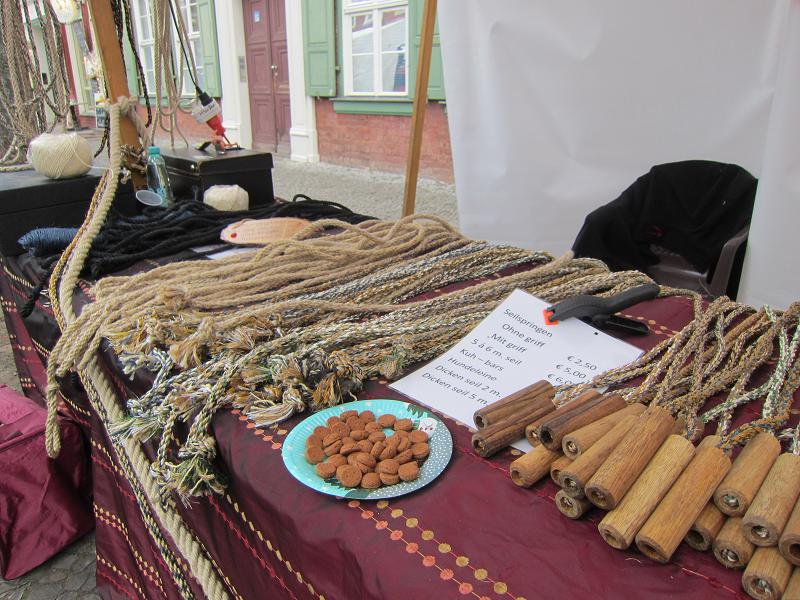 Das Seil ist fast fertig. Nun wird es noch abgenommen und die Enden der Schnüre miteinander verknotet. |