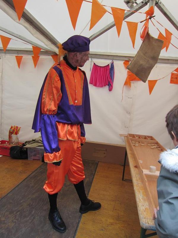 Ein Schwarzer Piet (Zwarte Piet) beobachtet die schwierige Kunst, soviele Plättchen wie möglich durch die kleinen Schlitze in den Kästchen dahinter zu schießen / schieben |
