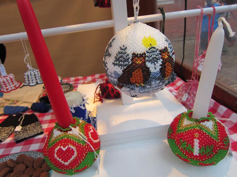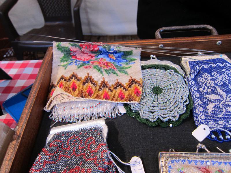 Perlenstrickerei von nahem. Die Künstlerin hat ihre Arbeit für einen Moment abgelegt. |